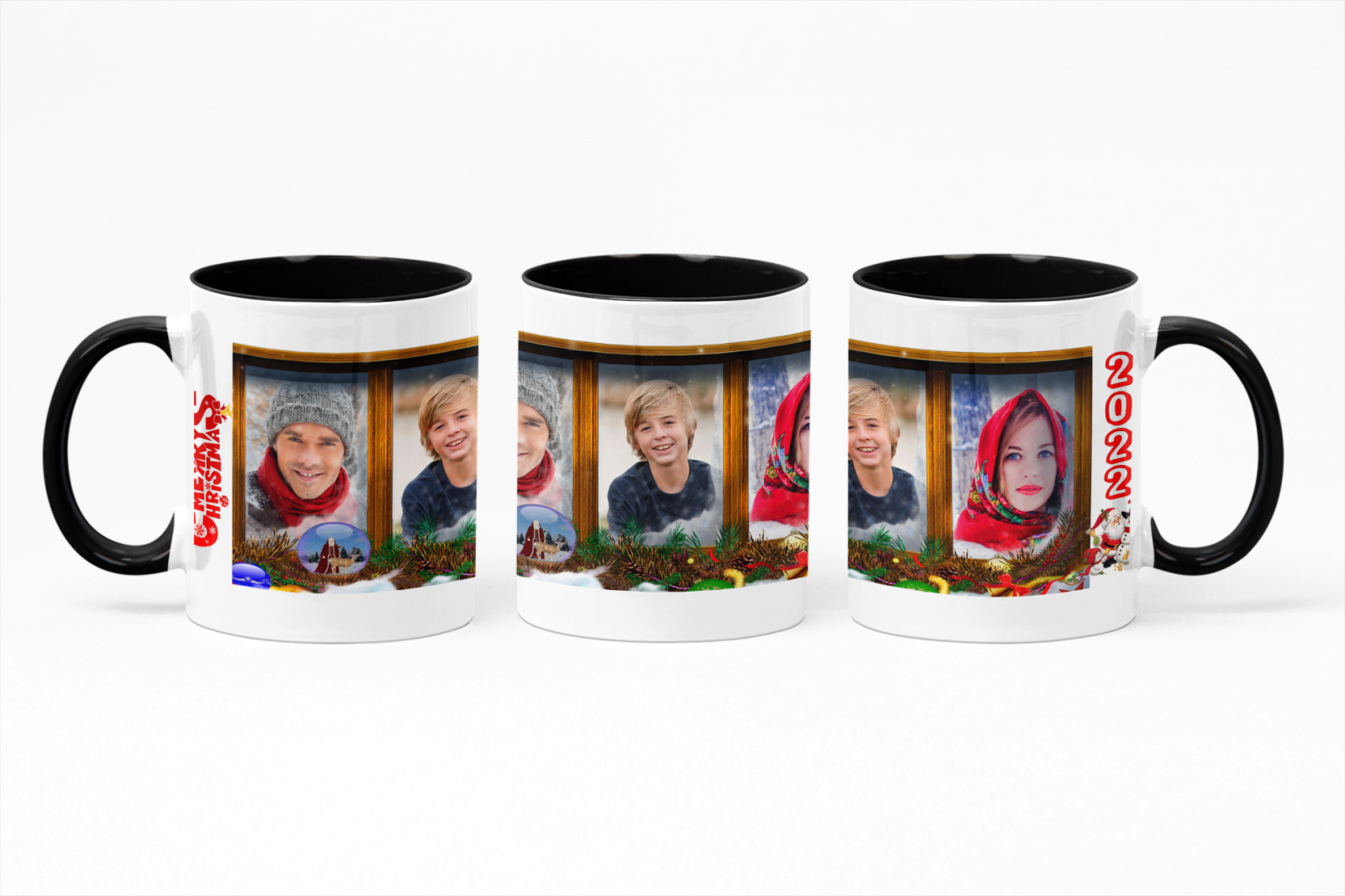 Cană personalizată de Crăciun cu colaj foto și decor festiv. Designul include trei portrete încadrate într-un peisaj de iarnă cu ornamente, globuri, crenguțe de brad și un sat acoperit de zăpadă. Pe lateral, mesajul „Merry Christmas” și anul „2025” sunt integrate artistic, iar în colțul de jos, Moș Crăciun și un om de zăpadă adaugă un strop de veselie. Este cadoul perfect pentru familie, prieteni sau colegi – un suvenir care păstrează amintirile și atmosfera sărbătorilor.