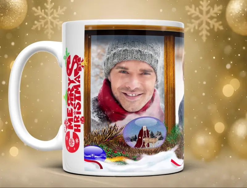 Cană personalizată de Crăciun cu colaj foto și decor festiv. Designul include trei portrete încadrate într-un peisaj de iarnă cu ornamente, globuri, crenguțe de brad și un sat acoperit de zăpadă. Pe lateral, mesajul „Merry Christmas” și anul „2025” sunt integrate artistic, iar în colțul de jos, Moș Crăciun și un om de zăpadă adaugă un strop de veselie. Este cadoul perfect pentru familie, prieteni sau colegi – un suvenir care păstrează amintirile și atmosfera sărbătorilor.