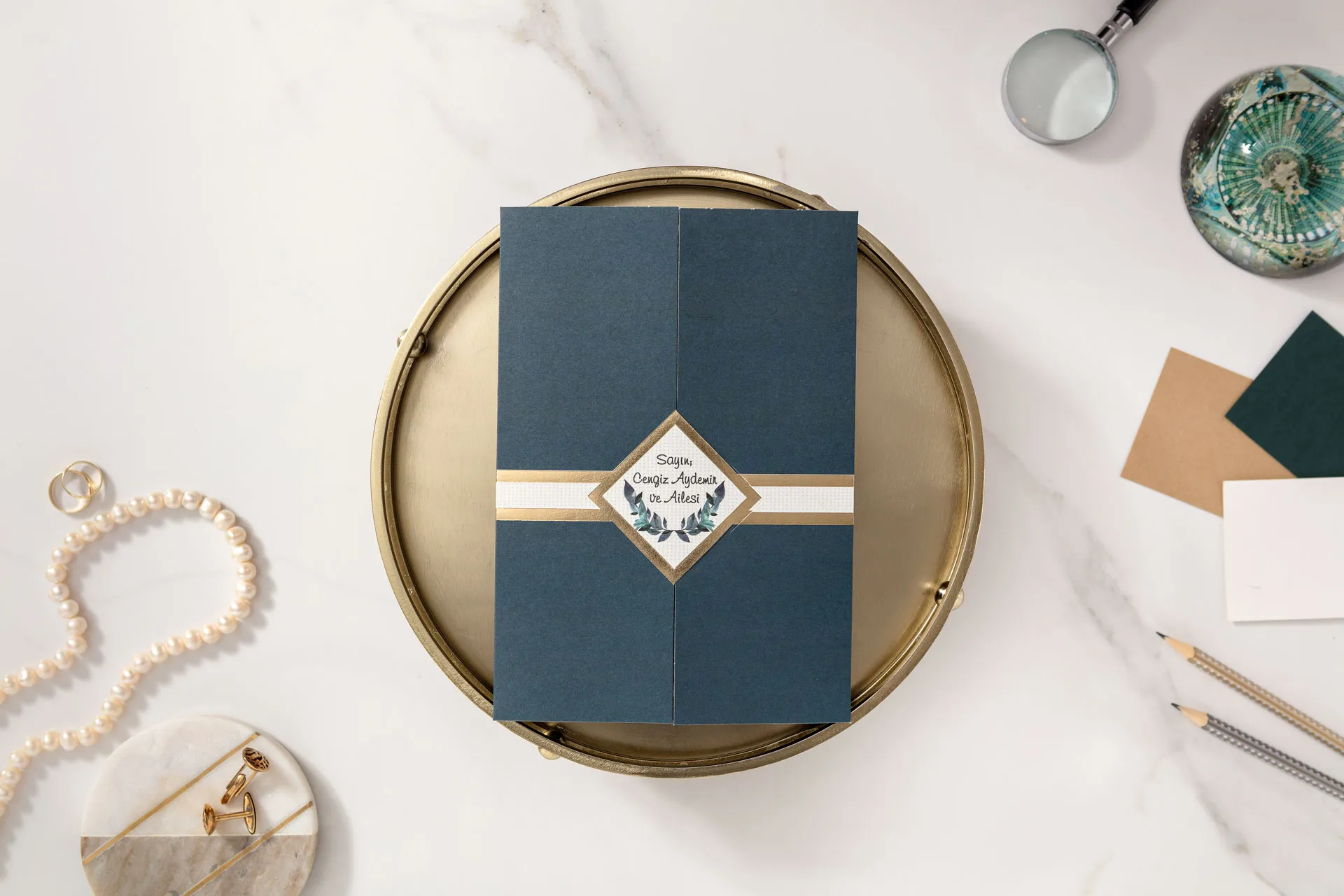 Invitațiile 10540-ikl-25 sunt alegerea perfectă pentru o nuntă elegantă și simbolică. Designul tip carte oferă un format aparte, unde cartonul alb cu un chenar bogat în motive de frunze în nuanțe de albastru și turcoaz devine centrul atenției. Acesta este inserat într-un carton exterior albastru închis, care se închide din laterale, formând un plic stilat și sofisticat.