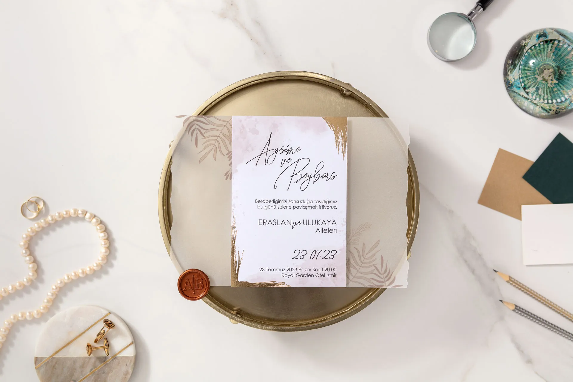 Fiecare invitație este învelită într-o hârtie de calc fină, imprimată cu frunze delicate, ce oferă un efect vizual sofisticat și o notă de mister plăcută la deschidere.