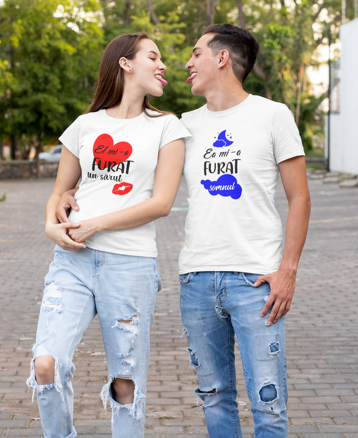 • Tricoul "El mi-a furat un sărut" – pentru ea, care își amintește cu zâmbet primul gest de apropiere. Cu un mesaj dulce și provocator, acest tricou surprinde acel moment magic în care iubirea a prins contur.